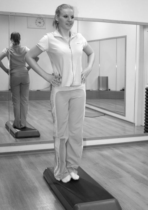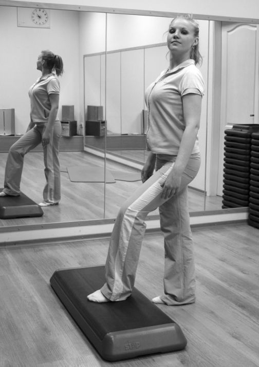 Поставьте правую ногу на степ, перенесите на нее тяжесть тела и поднимитесь, приставив левую ногу на расстоянии 30 см от правой. Затем обопритесь на левую ногу и правой спуститесь с шаговой платформы на пол, приставьте рядом левую ногу, вернувшись таким образом в исходное положение. Повторите 6 раз, расслабьте мышцы ног и вновь начинайте, но с другой ноги.