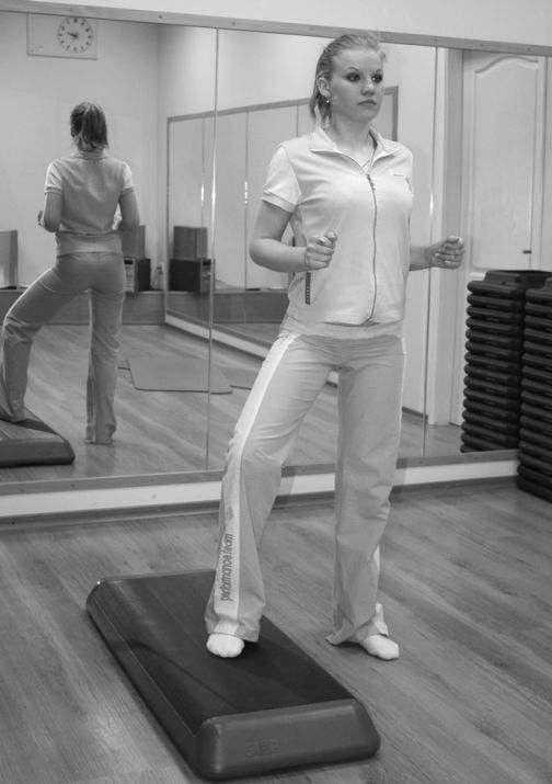 Исходное положение: встаньте лицом к шаговой платформе, руки согните в локтевых суставах, ноги поставьте вместе. Поставьте правую ногу на степ, перенесите на нее тяжесть тела и приставьте другую ногу. Спуститесь подобным же образом. Выполняйте сначала в медленном темпе, ощущая напряжение каждой мышцы, а затем в энергичном, ритмичном темпе под музыку.