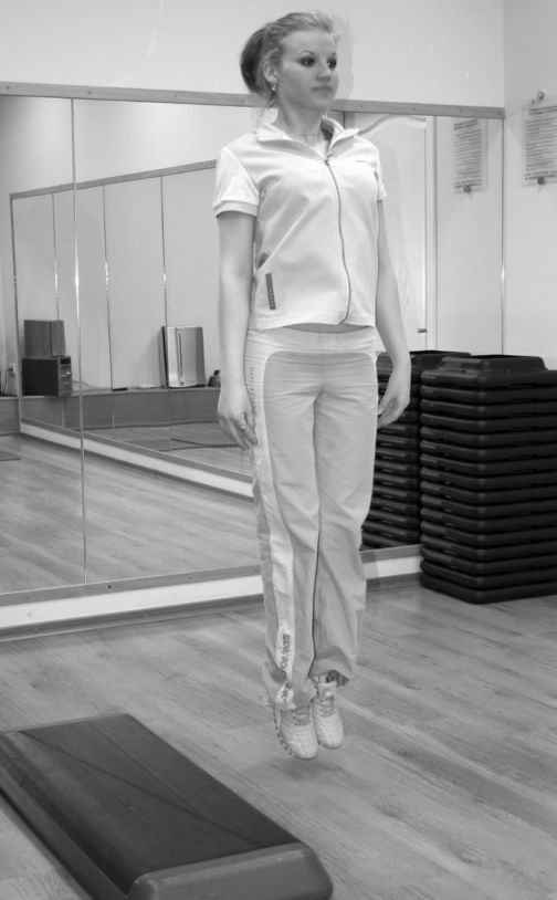 Поставьте правую ногу на степ, затем сделайте невысокий прыжок, во время которого поменяйте ноги – правая должна оказаться на полу, а левая на степе. Всю тяжесть тела при этом перенесите с одной опорной ноги на другую. Мышцы ноги, находящейся на степе, должны быть расслаблены.