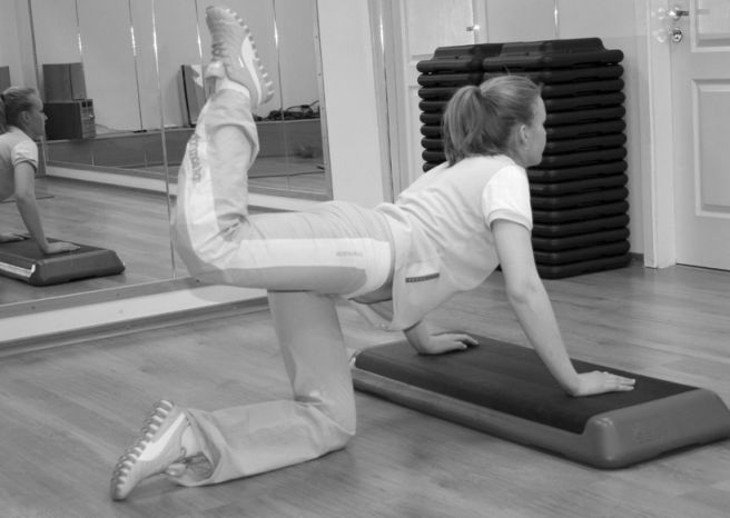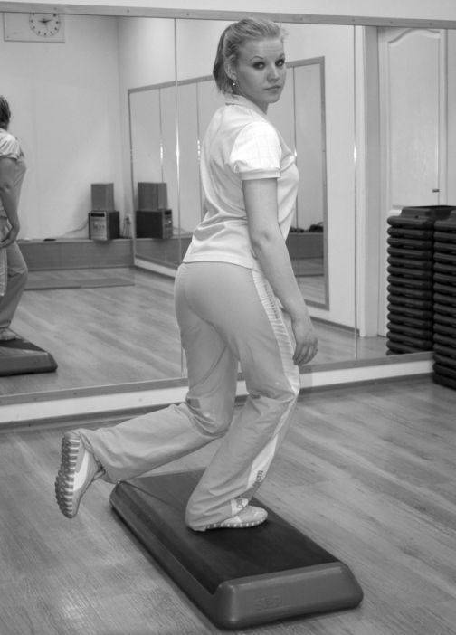 Наклонитесь и обопритесь руками о степ. Правой ногой шагните далеко назад с опорой на носок, согнув при этом левую ногу. Задержитесь на несколько секунд и присоедините левую ногу к правой. Оставайтесь в таком положении несколько секунд, почувствуйте напряженные мышцы ног, рук и брюшного пресса. Затем правую ногу согните в колене, к ней приставьте левую и примите исходное положение. Сделайте не менее 10 раз.