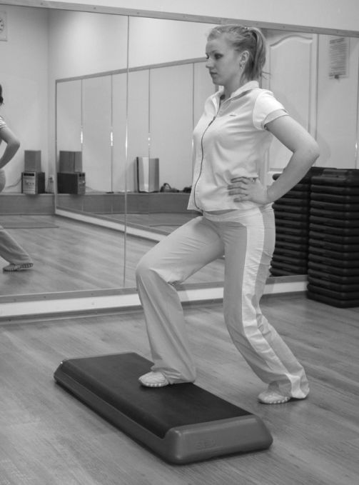 Исходное положение: встаньте к шаговой платформе правым боком, руки согните, правую ногу поставьте на степ.