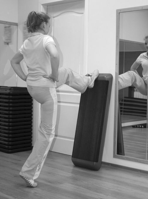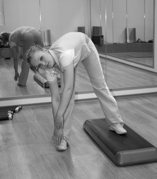 Положите ногу на спинку стула или любую другую возвышенность приблизительно на уровне талии, отступив другой ногой на расстояние шага. Согните ногу в колене и перенесите на нее тяжесть тела, после чего сделайте несколько пружинящих покачиваний и выпрямите ногу. Затем наклонитесь и попытайтесь дотянуться кончиками пальцев до носка, по возможности обхватив ступню руками. После этого, не снимая ноги со спинки стула, выполните несколько глубоких приседаний на опорной ноге. Затем наклонитесь к ней, не сгибая ноги, и дотянитесь до носка. Положите другую ногу на возвышенность и проделайте те же растягивающие движения.