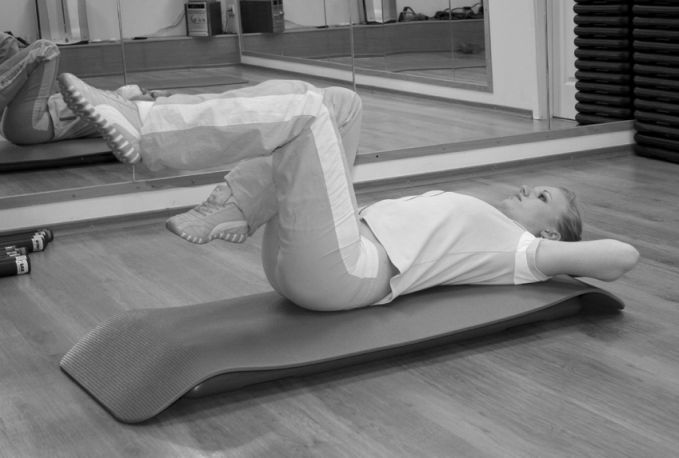 Примите исходное положение упражнения 3. Подтяните ноги, согнутые в коленях, к груди, одновременно приподнимая плечи. Старайтесь по возможности максимально компактно сгруппироваться, задержитесь в таком положении на 3–4 с.