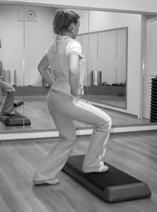 Исходное положение: встаньте спиной к шаговой платформе, ноги поставьте вместе, руки держите согнутыми в локтевых суставах.