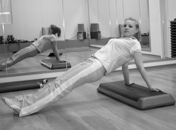Сядьте на край шаговой платформы, ноги вытяните вперед, обопритесь на руки. Опираясь на ступни и руки, приподнимите тазобедренный сустав, придав корпусу форму прямой наклонной линии. Далее выполните несколько отжиманий, сгибая и выпрямляя руки. Вернитесь в исходное положение (фото 41).