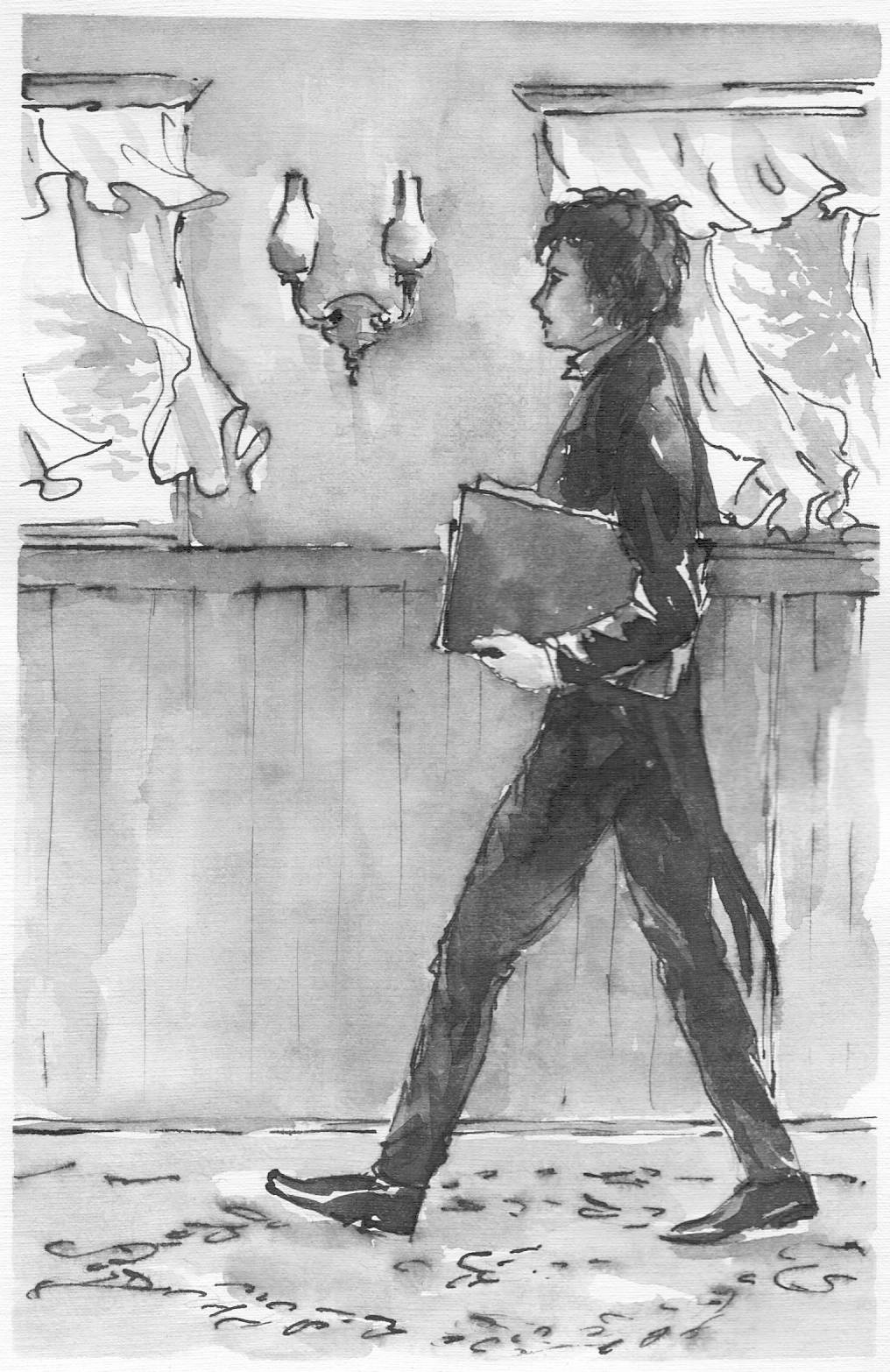 Наконец он собрал их все, и, пересчитав, понял, что одного документа не хватает. Юноша огляделся и заметил, что край потерянной бумаги торчит из-под прикрытой деревянной двери одного из купе. Молодой человек подошёл ближе, наклонился за листом, и в этот момент через щёлку двери он увидел девушку.