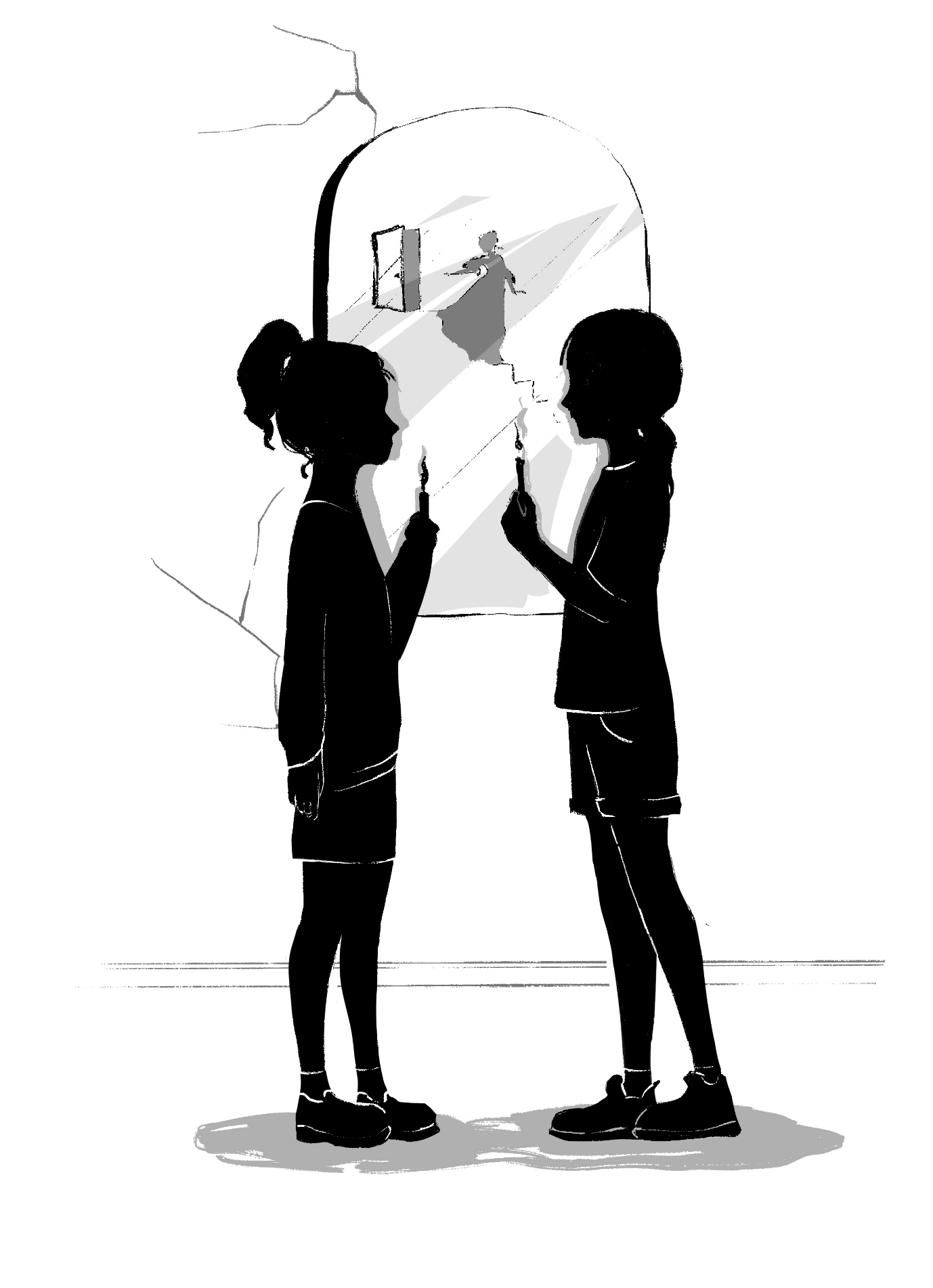 – Отличная идея! – воскликнула Аня, достала из косметички помаду и показала её остальным. – Вот! Этим мы нарисуем на зеркале лестницу.