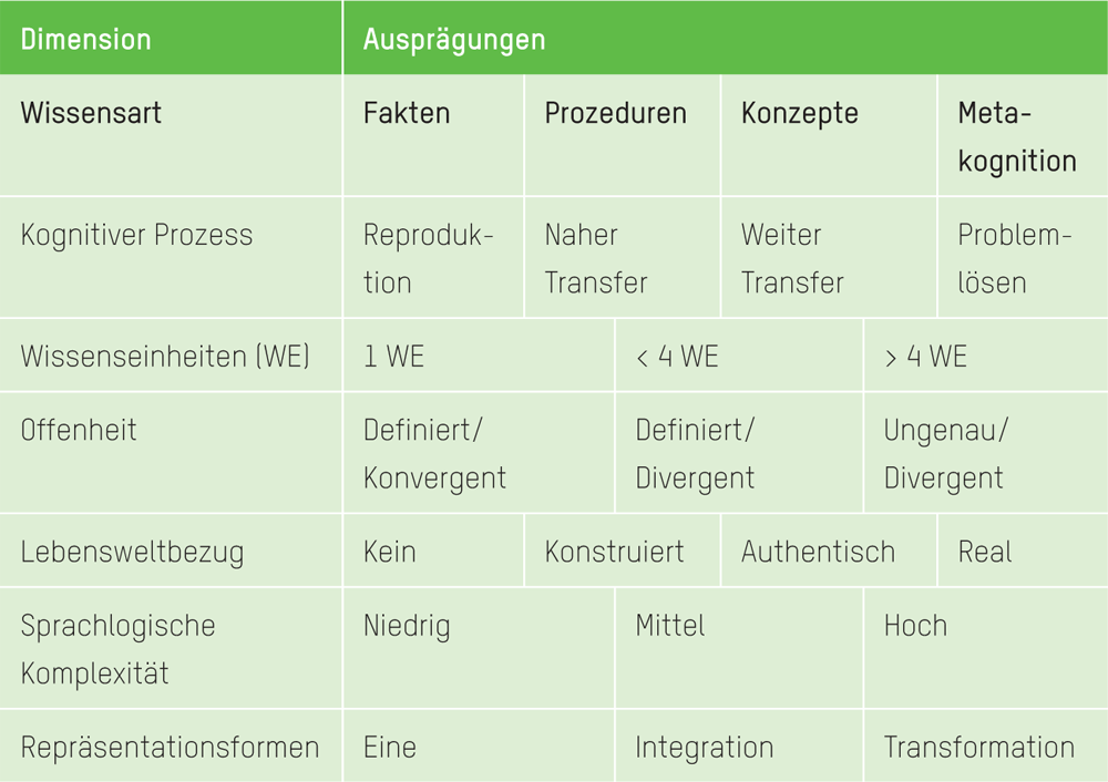 Die vorgeschlagenen Dimensionen lassen sich in einer Lernaufgabe in verschiedenen Ausführungen realisieren und zeigen deren vielfältige Gestaltungsmöglichkeiten auf. Dies kann mit einem Mischpult verglichen werden, bei dem die unterschiedlichen Einstellmöglichkeiten in der Folge zu unterschiedlichen Ergebnissen führen. Einen bedeutsamen Einfluss auf die Gestaltung von Lernaufgaben haben die Dimensionen Wissensart und kognitiver Prozess, wie Forschungsarbeiten hinreichend belegen (vgl. ebd. hier.). Diese wiederum korrelieren mit dem Umfang des in einer Lernaufgabe zu bearbeitenden Wissens, was U. Maier et al. als Wissenseinheiten bezeichnen und Einfluss auf die Komplexität einer Lernaufgabe hat.
