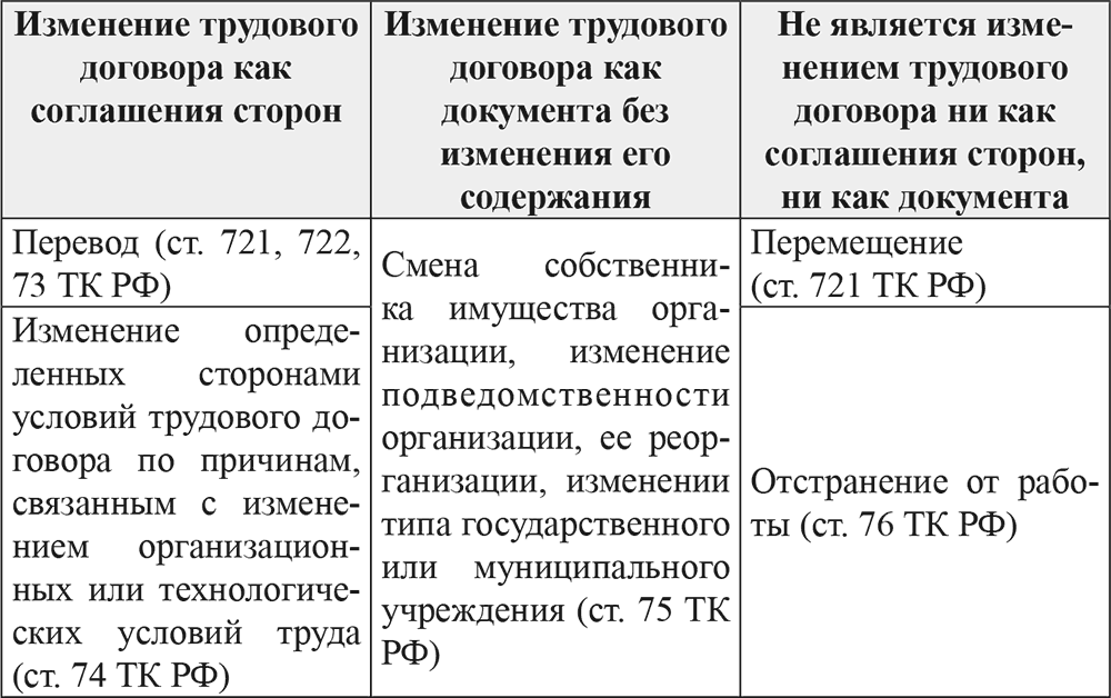Несмотря на то, что мы придерживаемся позиции ученых санкт-петербургской школы трудового права, перемещение и отстранение от работы, по сути не являющиеся изменением трудового договора, будут рассмотрены нами в данном параграфе, поскольку правильная квалификация перемещения необходима для отграничения его от перевода, а нормы об отстранении от работы так или иначе связаны с изменением трудового отношения (по общим правилам, при отстранении работника от работы за ним не сохраняется заработная плата).