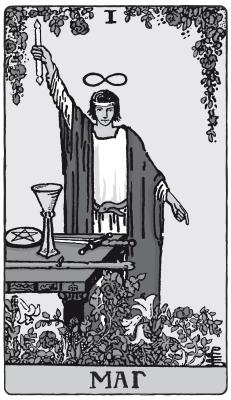 Меркурий. Астрологически аркану Маг соответствуют планета Меркурий и одноименный бог, которого также называют Гермесом Трисмегистом, Тотом. Автор колоды Уэйт в своей книге пишет о Маге как о мужчине с ликом божественного Аполлона, с уверенной улыбкой и сияющими очами. И кажется, что это может быть указанием на солнце. Но в Древней Греции с Аполлоном ассоциировался утренний Меркурий, которого также величали Стилбон, что переводится как «сияющий». Поэтому мы видим, что акценты на лике Аполлона и сияющих очах мага – прямое указание на Меркурия. Этот бог связан с ртутью в алхимии и представляет собой деятельный, активный элемент, покровительствует знаниям, обучению, изобретательской деятельности, ораторскому и писательскому искусству и хитрой изворотливости, которая необходима для успеха в торговле и адвокатском деле. Указание на это соответствие Меркурию зашифровано на карте в следующих символах: