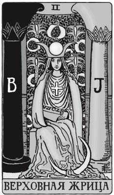 Верховная жрица. В предшествующих колодах аркан назывался «Папесса». В XVIII веке с приходом моды на все египетское Кур де Жебелен, будучи уверен, что Таро берет начало в культе древнеегипетской богини Изиды, переименовал аркан в Верховную жрицу. Ее образ отошел от христианского и стал больше похож на стиль древнеегипетских богов, хотя черты Девы Марии в Таро Уэйта явно отражены. После смены названия главная героиня на карте чаще воспроизводится в образе языческой жрицы с элементами смешения различных культов. Жрица – служительница культа, почитавшаяся как посредник в общении людей с миром богов и духов.