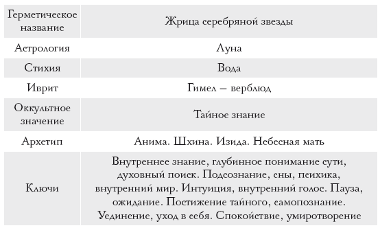 На берегу безбрежного океана сидит прекрасная жрица, у ее ног покоится полумесяц, а на голове рогатая диадема с прозрачной сферой посередине. Ее наряд, подобно потокам воды, струится и стекает вниз, чтобы слиться с океаном и вернуться к своему первоистоку. На груди у жрицы большой солнечный крест, в руках она держит свиток, на котором начертано слово «Тора», означающее высший закон, тайный закон и внутренний смысл слова. Свиток частично сокрыт ее мантией, это указывает на то, что под тем, что произносится вслух, существует нечто под этим подразумевающееся, но не показывающееся. Жрица сидит между черной и белой колоннами мистического храма, а позади нее завеса, расшитая пальмами и гранатами. Ее называют оккультной наукой на пороге святилища Изиды, но на самом деле это тайная церковь, дом, в котором человек обретает Бога. Она духовная невеста и мать, дочь звезд и высшего райского сада. По сути своей она королева заимствованного света, но это свет всего сущего. Она Луна, вскормленная молоком Божественной матери. С мистической точки зрения Шхина – это духовная невеста праведника, и когда он читает закон, она придает ему божественный смысл. В некоторых отношениях эта карта является высшей священной из Великих арканов.
