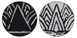 Три треугольника. Три элемента в алхимии, три матери на Древе жизни (три высшие сефиры на Древе жизни, которые порождают все остальное древо, – Кетер, Хокма и Бина). Черный цвет на белом фоне и белый цвет на черном фоне – это идея инь и ян (взаимообмена и примирения противоположных сил, идея вечного равновесия света и тьмы).