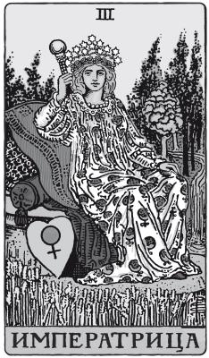 Величественная женщина в богатом облачении восседает на троне. Ее диадема состоит из двенадцати звезд, собранных в миртовом венце. На щите, который покоится у ее ног, изображен символ Венеры. Перед нею зреет пшеничное поле, а за спиной мы видим лазурный водопад, потоки воды которого проистекают в эту плодородную долину. Скипетр в ее руке увенчан земным шаром, и весь образ олицетворяет вселенскую плодовитость. Императрица представляет собой и дверь, или врата, через которые мы попадаем в эту жизнь, как в Сад Венеры; и также этот путь выводит отсюда в потустороннее, в область, являющуюся тайной Верховной жрицы, которую она открывает лишь избранным.