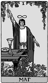 Юноша в ритуальном облачении стоит перед столом, на котором расположены магические инструменты, он волен распоряжаться ими по своему усмотрению. Его правая рука поднята вверх и держит белый жезл, а левой он указывает вниз, что символизирует принцип Гермеса Трисмегиста: «То, что наверху, подобно тому, что внизу».
