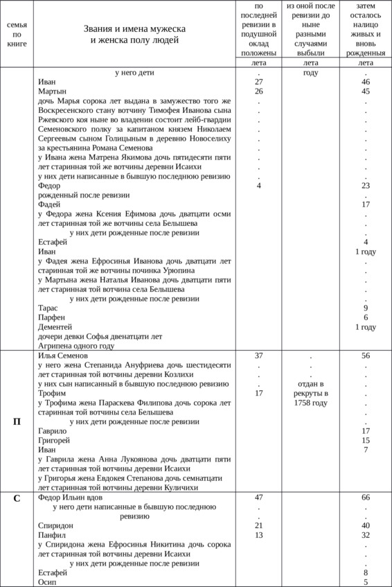 Итого в оной деревне Куличихе по второй ревизии состояло мужеска полу 64 души. И с той ревизии выбыло вышеприписанными случаями – 26. И со второй ревизии налицо – 38, у них после ревизии новорожденных – 34, итого ныне налицо – 72. Женска полу выданных в другие вотчины в замужество – 6. Всего налицо в оной деревне Куличихе – 78.