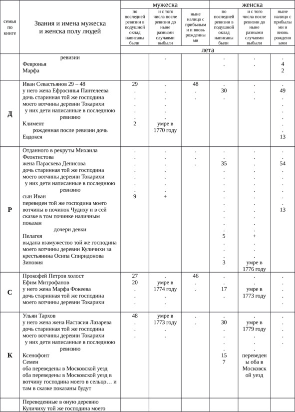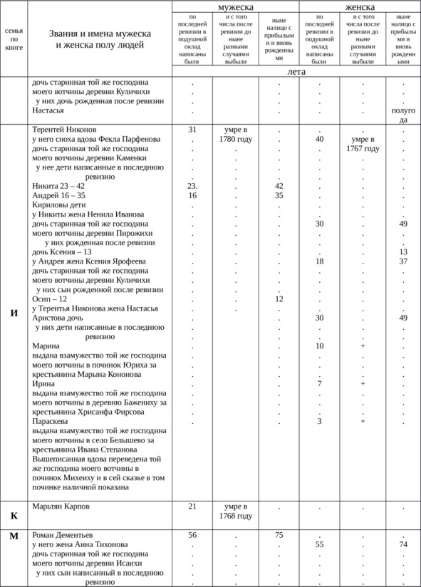 К 4-й ревизии еще одно крестьянское семейство прекратило свою родословную ветвь, связанную с деревней Куличиха. Род, восходившей в 1-й ревизии к Ивану Игнатьеву и переросший в две ветки его внуков – Карповых и Тархановых, теперь не оставил и следа в деревне. Единственный представитель первой ветки Мартын Карпов не был женат и умер бобылем в 1768 году в возрасте 36 лет.