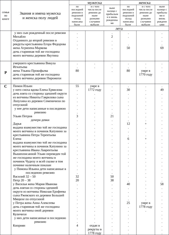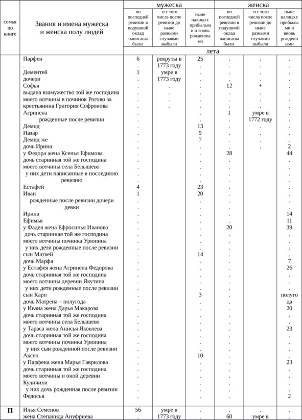 В начале 70-х старший сын Семен Петров нашел себе невесту и собирался жениться, но судьба распорядилась иначе – тяжелая болезнь одолела молодого парня, от которой не смогли избавить – в 1772 году Семен помер в возрасте 21 года. Младший сын Акинфей Петров женился перед самой ревизией в 1781 году – 18-летняя Ефросинья Харитонова взята из вотчины же князя Одоевского из деревни Якутина.