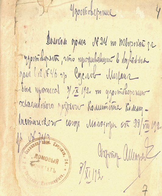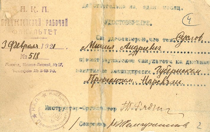 Судя по архивам, к занятиям на рабфаке Суслов приступил не в сентябре 1920-го, а в начале 1921 года. Входной билет для посещения вечерних занятий, с 18.30 до 21.30, он получил 23 января. Однако уже через неделю «тов. Суслов Михаил Андреевич принят слушателем факультета на дневные занятия по командировке губернским профсоюзом Наркомсвязи»[24]