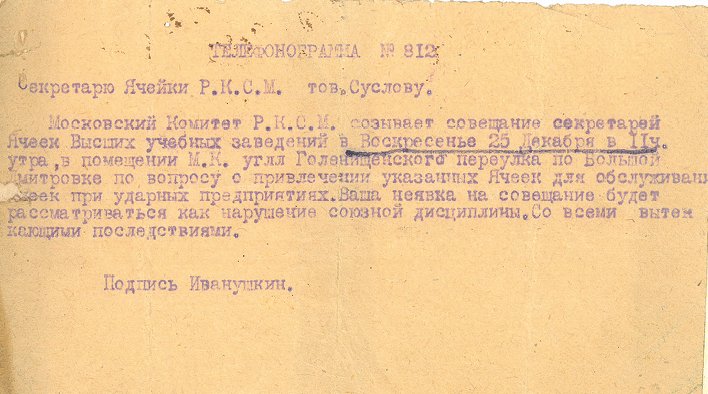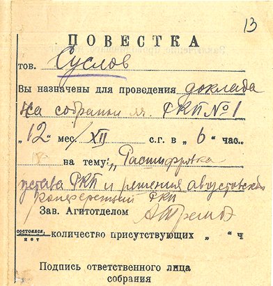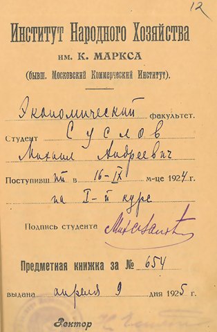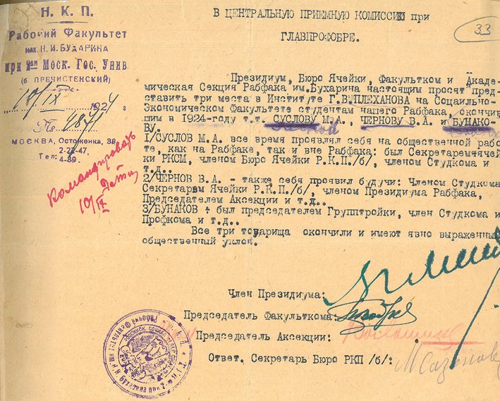 «Выдвинуть тов. СУСЛОВА Михаила Андреевича, члена ВКП(б) с 1921 г., окончившего ВУЗ в 1927/28 учеб<ном> году по Плановому Отделению Экфака и просить Зам<оскворецкий> райком командировать т. Суслова в счёт мест, предоставленных Московской организации.