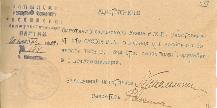 Документ о должности М.А. Суслова в Хвалынске в 1922–1923 гг. [РГАНИ]