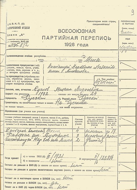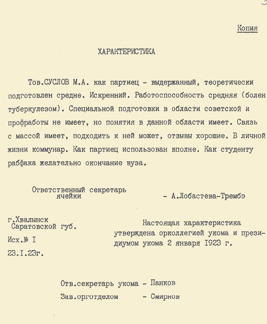 Тов. Суслов Михаил Андреевич, рождения 1902 г., член ВКП(б) с 1921 г., член ВЛКСМ с февраля 1920 г. Крестьянин. Член Укома комсомола 1921—22 гг. Секретарь ячейки комсомола, 1922 г. секретарь ячейки ВКП(б). 1920 г. секретарь Наркомпочтеля. 1924/25 контролёр НКФ. В ВУЗе секретарь академич<еской> группы, парторганизатор, преподаватель в Техникуме политэкономии и истмата, пропагандист. Общетеоретическ<ая> и марксистская ленинская подготовка хорошая. Марксист. ленинским методом владеет вполне. Партийно выдержанный, идеологически устойчив. Имеет склонность <к> научно-исследовательной и педагогической работе. Работает систематически и упорно. Легко преодолевает трудности в работе. В общественно-партийной жизни активен. Обнаруживает склонность к исследовательно-научной работе. Выделен цех. ячейкой Планового Отделения (Оргхоз) на научную работу в РАНИОН»[32].