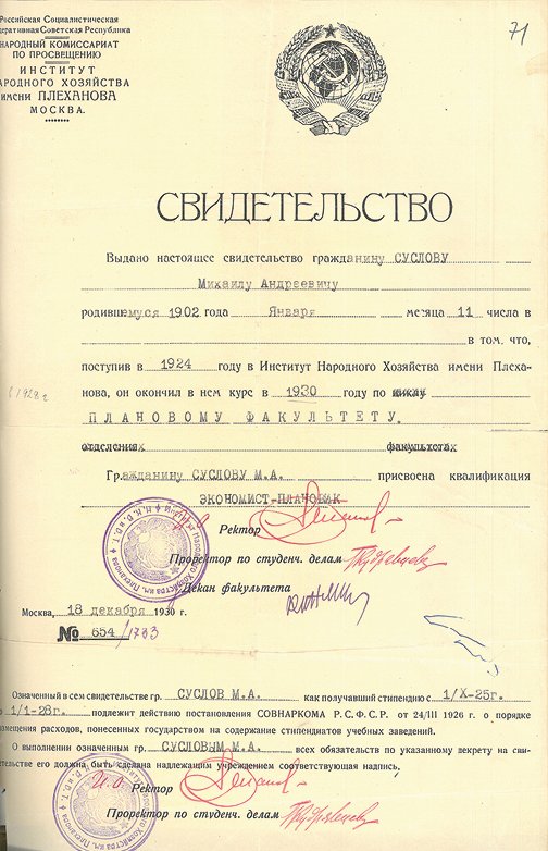 Ни в Центральной приёмной комиссии, ни в Главке возражать не стали. Так Суслов оказался студентом планового отделения экономического факультета Института народного хозяйства имени Плеханова. Это официальная версия.