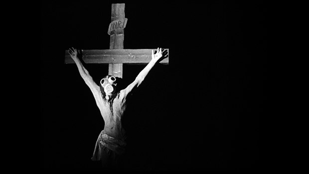 Внимание солдата привлекает Георгиевский крест: «Георгиевский крест на ладони солдата, он разглядывает его, что-то шепчет, сжимает и разжимает в руке крест. Он мучительно старается что-то вспомнить. Как ребенок берет крест в рот, грызет. Вспомнились… кресты на церквах… кресты кладбища… / распятие на дороге. Луч прожектора, бредущий по полю… Распятие на дороге, – вероятно, Галиция. Раненый дополз до подножья креста. Он поднимает к распятию руки и машет кулаками, моля о помощи. / На лице Христа – противогаз» (Там же: 45). Появляется танк, который наезжает на раненого и давит вместе с ним распятие: «Раненый, обезумев от страха, крутится около подножья креста, заслоняясь им от танка. / Танк медленно надвигается на распятие. Повалил крест, прошел по нему» (Там же). Остается вдавленная солдатская шинель на снегу, на которую «чья-то почтительная рука» опускает «светлый Георгиевский крестик» (Там же).
