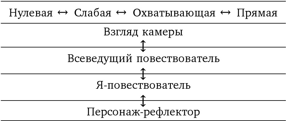 Проблема градации точек зрения при переходе от нарратора к рефлектору нашла отражение в концепциях, ориентированных на морфологическое изучение нарратива. Моника Флудерник, развивая идеи Франца Штанцеля, предлагает исследовать восприятие «взгляда камеры», нарратора и персонажа. В ее концепции нарратив посредством взгляда камеры предполагает безличную точку зрения, внешнюю по отношению к миру истории (этот нарратив, безусловно, в первую очередь и характерен для киносценария). Точка зрения нарратора тоже всегда является внешней, но в то же время нарратор имеет некоторые личностные характеристики. Персонаж – это телесная антропоморфная фигура, которой свойственна внутренняя точка зрения, имманентная миру истории. На этой шкале между нарратором и персонажем располагается нарратив от первого лица, в котором повествовательное «я» существует одновременно и в диегезисе, и за его пределами (Fludernik 2009: 36–39)4.