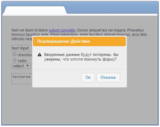 При нажатии кнопки [Ок] пользователь теряет данные и переходит по ссылке, при нажатии кнопки [Отмена] диалог закрывается и пользователь остается на текущей странице.