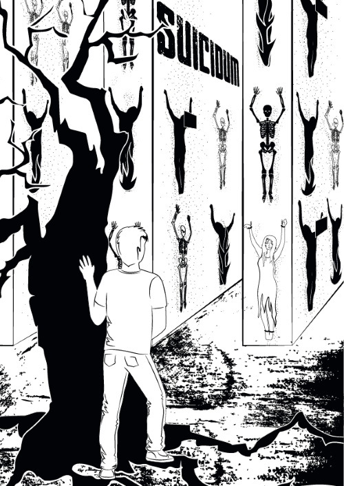 Забыв обо всём, Алекс, как заворожённый, смотрел на последние мгновения жизни людей. Сцены воспринимались ужасно: одни бросались под колёса поезда, другие прыгали с крыш домов, кто-то лез в петлю или резал вены, многие пускали себе пулю в голову. Как только на экране человек совершал суицид, экран исчезал. Из отверстия под ногами связанного грешника вырывался огонь, который начинал поглощать свою жертву.