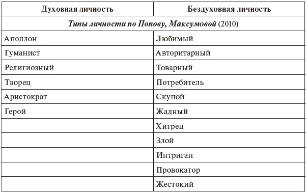 Типы, выделенные Л. М. Поповым и А. О. Максумовой, которые относятся к категориям «духовной» и «бездуховной» личностей, представлены нами в таблице 5.