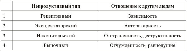 Основываясь на идеях Т. Веблена, можно говорить о выделении по критерию ценностно-смысловой направленности противоположных типов, связанных с «демонстративным потреблением» и «инстинктом мастерства», что соответствует типам «человек берущий» и «человек дающий». Такое же противопоставление существует у Э. Формма, который различал два типа характера: 1) непродуктивные ориентации и 2) продуктивные ориентации. К первому непродуктивному типу относятся четыре подтипа (таблица 6).