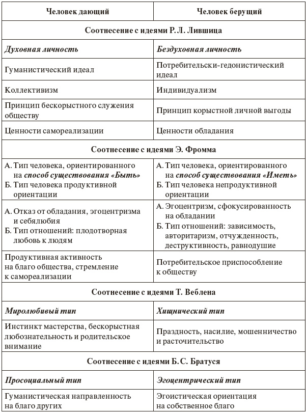 Типы «человек дающий» и «человек берущий» в соотнесении с типами личности в концепциях Р. Л. Лившица, Э. Фромма, Т. Веблена, Б. С. Братуся