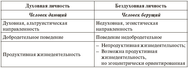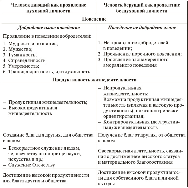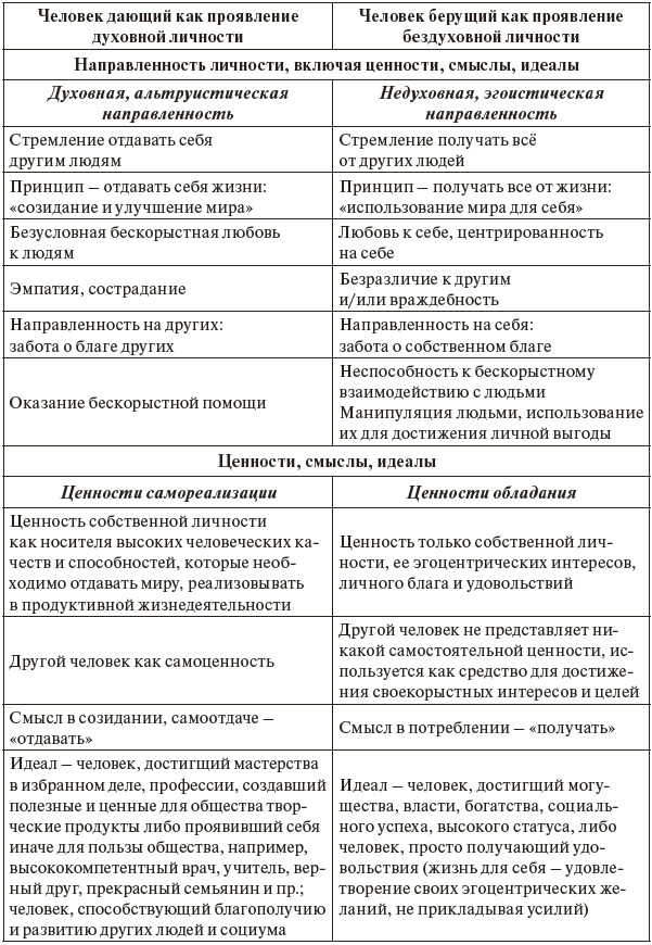 Рассмотренные нами аспекты проявления типа «человек дающий» как основы конструкта «духовная личность» представлены в таблице 8 в противопоставлении типу «человек берущий», отражающему недуховные устремления.