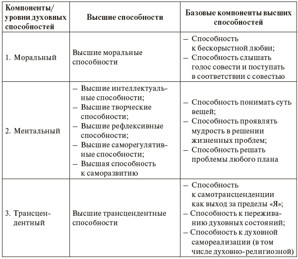Развивая идеи Шадрикова, мы определяем духовные способности как свойства личности, отражающие единство ее интеллектуальной и нравственной сфер, обеспечивая симультанное проявление в реальном поведении и деятельности трех составляющих духовных способностей: 1) морального компонента/уровня – связан с высшими моральными способностями (высшими ценностно-нравственными и смысловыми устремлениями); 2) ментального компонента/уровня – включает высшие интеллектуальные способности, например, мудрость, высшие рефлексивные, саморегулятивные, творческие способности, а также высшую способность к саморазвитию; 3) трансцендентного компонента/уровня – предполагает такие высшие трансцендентные способности, как выход за пределы «Я» в служении людям и обществу, переживание специфических духовных состояний.