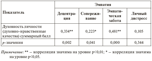 Взаимосвязь показателей духовно-нравственных качеств (духовность личности) и эмпатии
