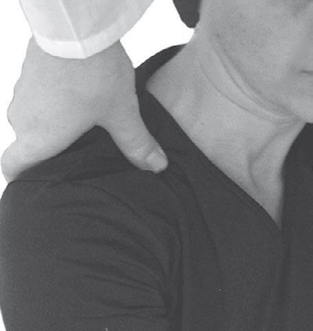 2. Поменяйте положение массирующей руки: большой палец вперед, четыре пальца на область надплечья, как на фото 8. Сожмите всеми пальцами одновременно мышцы, находящиеся над лопатками. Потяните их вверх. Повторите эти приемы 3 раза. (Аналогичные приемы проделайте отдельно для правой и левой надключичной областей, когда больной лежит на боку.)