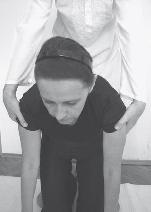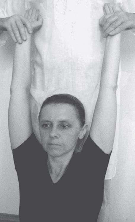 4. Обхватываем больного за плечи и слегка приподнимаем туловище вверх. Плечи сжимаются и поднимаются относительно позвоночника (как при недоуменном пожимании плечами). При этом тело больного должно быть расслаблено (фото 10).