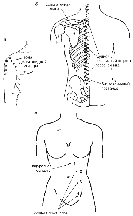 5. Теперь больного надо перевернуть на спину. Слегка надавить открытой ладонью на зоны от надчревной области (рис. 4, в) до ободочной кишки (смотрите на точки передней части корпуса и при надавливании следуйте порядку нумерации точек).