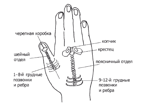 Массаж рефлекторных зон позвоночника на пальцах и ладониГрудной и шейный отдел позвоночника энергетически связаны с активными зонами на больших пальцах руки. Массаж больших пальцев руки снаружи равноценен обработке грудного и шейного отделов позвоночника. За нижние отделы позвоночника отвечает срединная линия наружной стороны ладони (рис. 5).