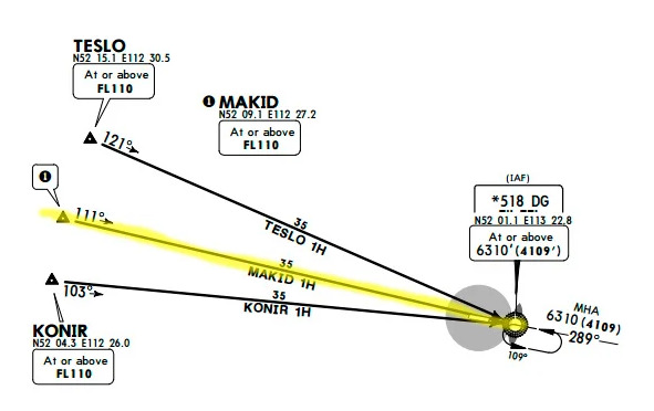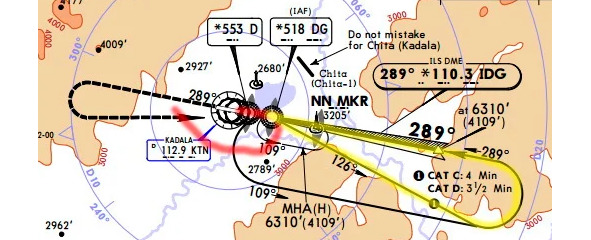 В Чите пилот Боинг-737 авиакомпании S7 Airlines, выполняющий рейс из Москвы, обычно летит по «дороге», отмеченной жёлтым маркером на рисунках. Сначала он с курсом 111° выходит на радиостанцию с позывным DG, далее три с половиной минуты летит с курсом 126°, прилично углубляется в горы, затем выполняет левый разворот на посадочный курс 289°, захватывает луч курсового маяка системы ИЛС, и следуя на высоте 1250 метров, долетает до точки начала снижения, находящейся примерно в тринадцати километрах от торца полосы. Долгий такой заход получается. Состариться успеешь!