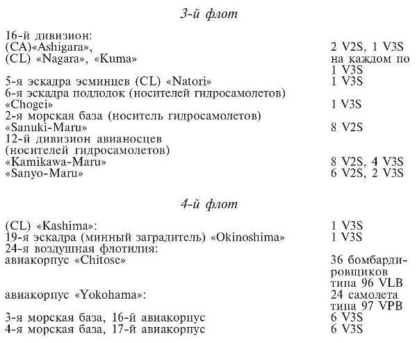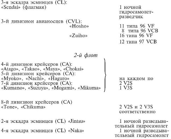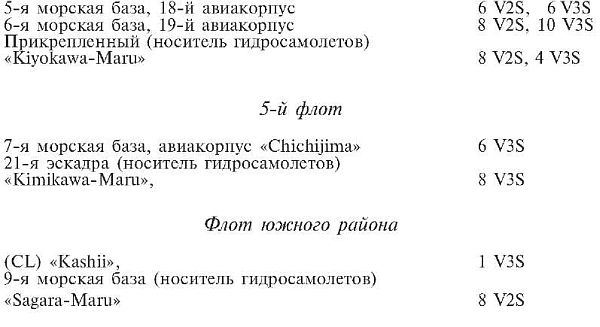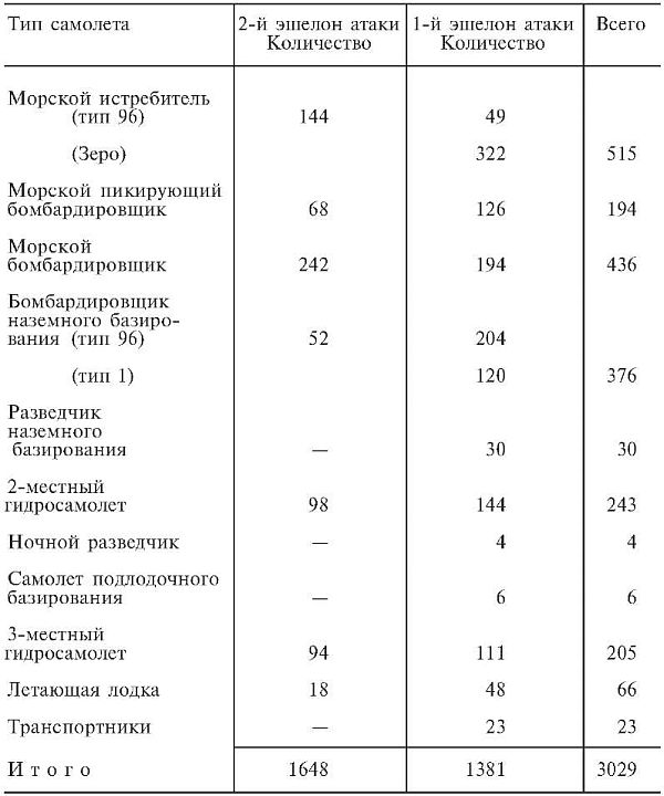В эшелоне первого удара все морские пикирующие бомбардировщики были типа 99; бомбардировщики морского базирования – типа 97; двухместные разведывательные гидросамолеты были типов 95 и 0; трехместные самолеты-наблюдатели были типа 0 и некоторые – типа 94; а все летающие лодки были типа 97.