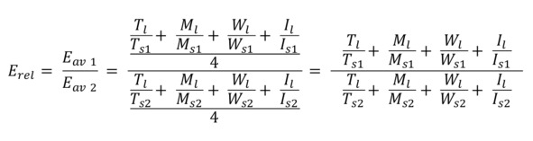 Относительная эффективность – это мера, которая выражает, во сколько раз больше или меньше в среднем можно совершить циклов выполнения задачи при помощи оцениваемого способа по сравнению с эталонным способом, с учётом всех используемых ресурсов, и значение которой равно отношению суммы абсолютных эффективностей оцениваемого способа по каждому из ресурсов в отдельности к сумме абсолютных эффективностей эталонного способа по этим же ресурсам.
