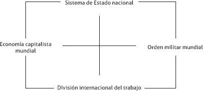 Las dimensiones de la globalización que establecen relaciones mutuas entre las partes son el sistema de Estado nacional, la economía capitalista mundial, el orden militar mundial y la división internacional del trabajo (ver figura 4).