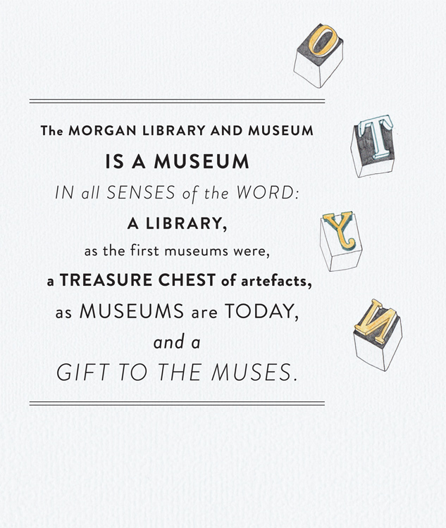 IF THE MUSES LOOK FOR heaven here on Earth, I think they must find it in museums. Originally more like libraries, museums were conceived as ‘shrines for the muses’, filled with books. It was only in the seventeenth century that they became showpieces for wonderful objects. The Morgan Library and Museum is a museum in all senses of the word: a library, as the first museums were, a treasure chest of artefacts, as museums are today, and a gift to the muses.