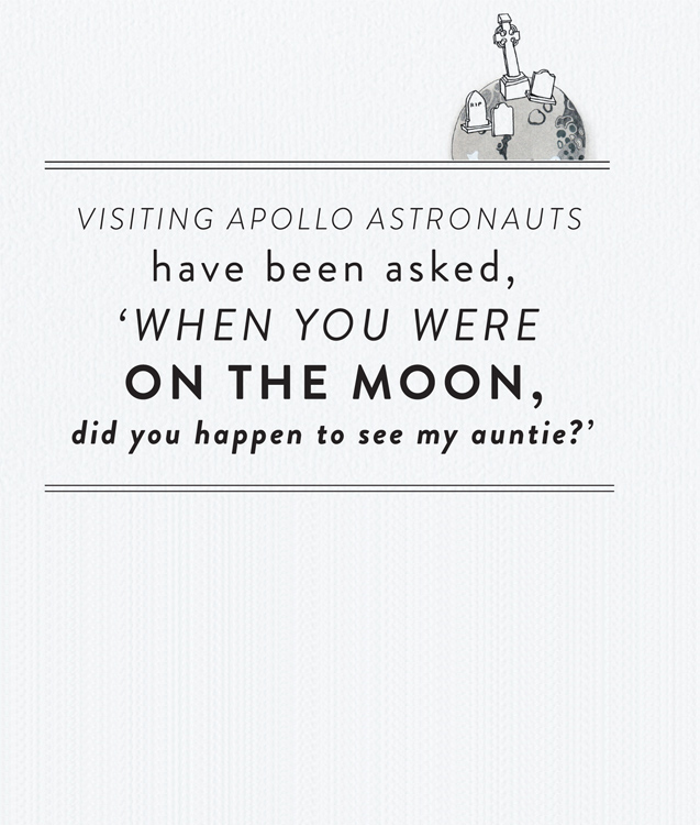 Those are the words on the first painting I ever chose for myself. I saw it in a little arty café in Cochin, Kerala, India. At the other end of the subcontinent, in Nepal, people think the dead live on the moon. Visiting Apollo astronauts have been asked, ‘When you were on the moon, did you happen to see my auntie?’