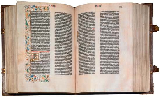 Inge Dupont, one of the librarians, brought it up out of the vaults of the Morgan and there it was, in two enormous volumes – Old and New Testament. It was sitting on a trolley, which Inge and her colleague wheeled across the reading room to a desk. Together, they heaved the New Testament up on to a lectern. They handed me a piece of acid-free card with which to turn the pages and asked me to turn them holding the bottom right-hand pages only. Then they left me alone with one of the most valuable books in the world. It was sublime. I felt so lucky. I’d seen a copy on paper in the New York Public Library, but it was behind glass. This civilization-changing beauty was here in my hands.