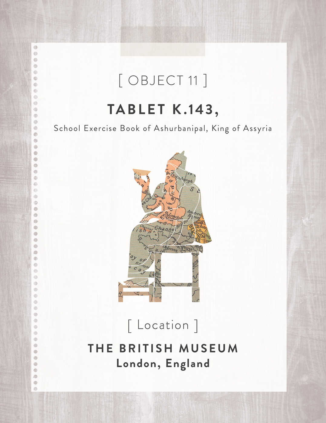 It’s an incantation, written in a child’s hand, with letters a centimetre high which aren’t joined up. It was written by King Ashurbanipal when he was a child and learning to write. This is his school exercise book. Just as you might still have a school exercise book or two at home, to remind you of when you were learning to write, the king must have decided to keep this clay tablet as a souvenir of his childhood, a marker of the days when his love of literature was formed.