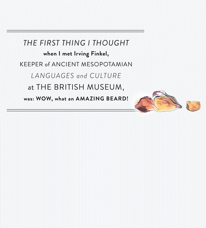 AS WE WALKED ACROSS THE great hall, we started chatting. Finkel is very friendly, kind, interesting and seriously clever. He is one of only a hundred or so people in the world who can read cuneiform, the oldest form of writing in the world.